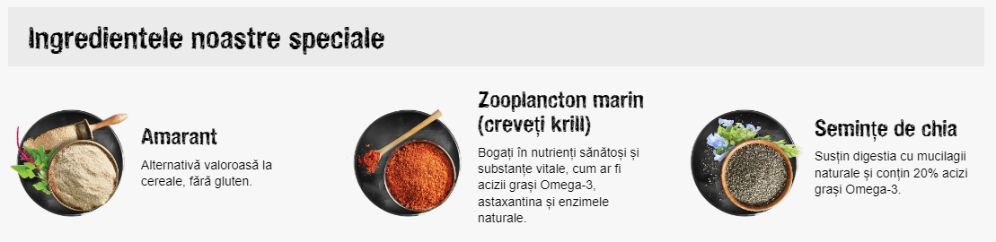 Compoziție: mușchi proaspăt de pasăre (30%); proteină de pasăre,nivel scăzut de cenuşă*¹ (23%); orez; porumb; făină din pește marin (9%); pulpă uscată de mere*¹ (4%); ficat de pasăre*²; secară*³; ou*¹; zooplancton marin (creveți krill)*⁴ (2,5%); tărâțe de ovăz (2,5%); drojdii de bere, inactivate*¹; semințe de chia (1,3%); grăsime de pasăre; clorură de sodiu; clorură de potasiu; inulină din cicoare *¹uscat *²hidrolizat *³malțificat *⁴măcinat.