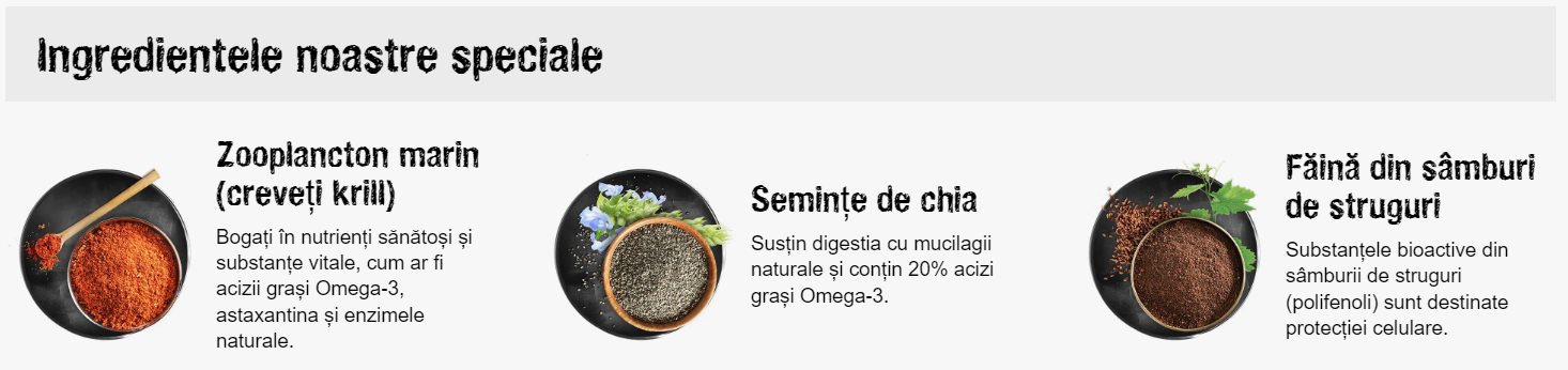 Compoziție: somon proaspăt (30%); orez; făină din pește marin (12,5%); proteină de pasăre,nivel scăzut de cenuşă*¹ (12,5%); porumb; grăsime de pasăre; zooplancton marin (creveți krill)*² (5%); ficat de pasăre*³; secară*⁴; ou*¹; drojdii de bere, inactivate*¹ (2,5%); sâmburi de struguri degresați (1,5%); semințe de chia (1,3%); roșcove zdrobite*¹; clorură de sodiu; clorură de potasiu; inulină din cicoare *¹uscat *²măcinat *³hidrolizat *⁴malțificat.