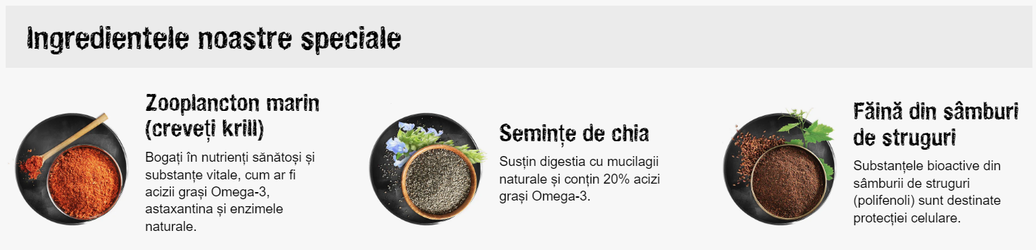 Compoziție: mușchi proaspăt de pasăre (30%); preoteine din rață*¹ (18%); orez; proteină de pasăre,nivel scăzut de cenuşă*¹ (10%); amidon din cartofi; grăsime de pasăre; ficat de pasăre*²; secară*³; ou*¹; făină din pește marin (2,5%); zooplancton marin (creveți krill)*⁴ (2,5%); drojdii de bere, inactivate*¹; sâmburi de struguri degresați (1,5%); semințe de chia (1,3%); roșcove zdrobite*¹; gumă de guar; clorură de sodiu; clorură de potasiu; inulină din cicoare *¹uscat *²hidrolizat *³malțificat *⁴măcinat